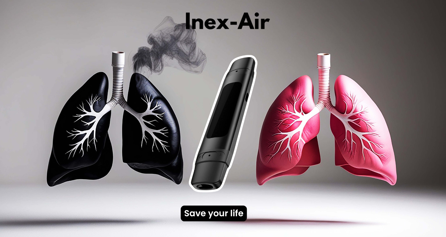 Inex‑Air is a handheld device that strengthens your breathing muscles through resistance and tracks your lung capacity in real time.